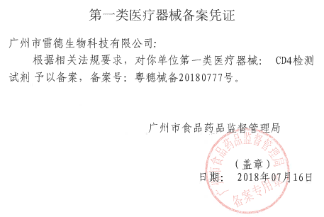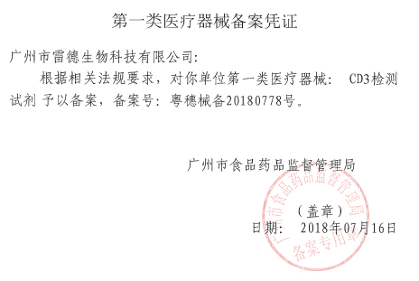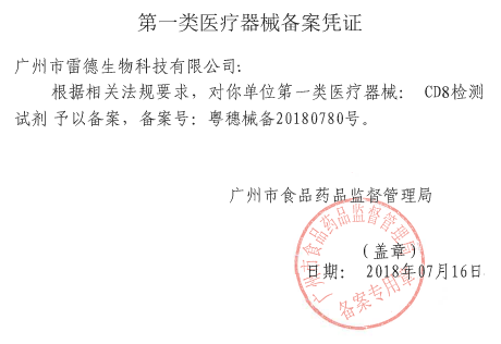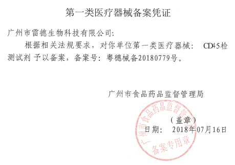 2018年7月16日,我公司自主研發(fā)的4款流式抗體產(chǎn)品“CD3、CD4、CD8、CD45檢測(cè)試劑”均通過了廣州市食品藥品監(jiān)督管理局的Ⅰ類醫(yī)療器械產(chǎn)品審批備案,正式獲準(zhǔn)上市銷售。