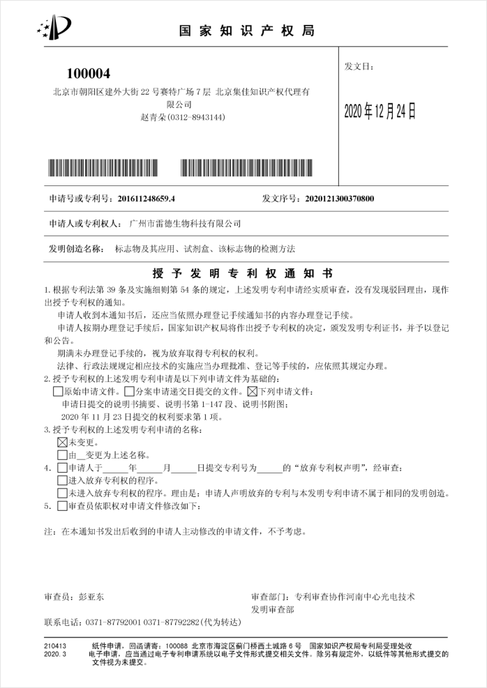 其中的一件核心技術發明專利的名稱為《標志物及其應用、試劑盒、該標志物的檢測方法》,申請號為“201611248659.4”,該發明于2020年12月24日獲得授權,這也是我司首次在類風濕關節炎(RA)血清學“標志物”方面獲得授權的發明專利。