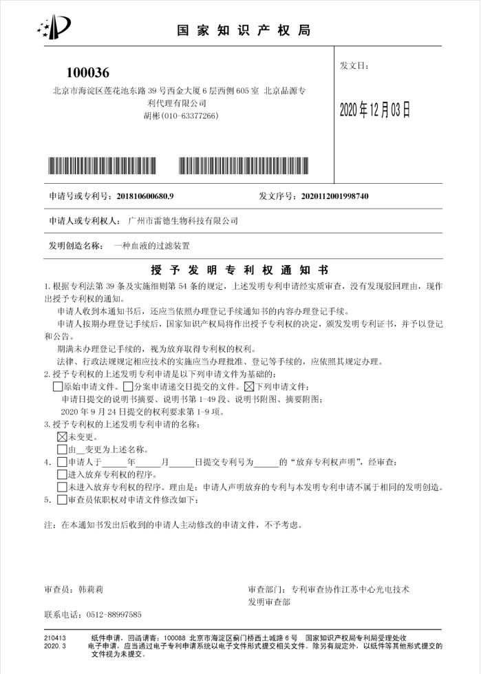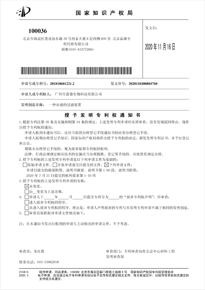 另外獲得授權的兩件核心技術發明專利名稱均為《一種血液的過濾裝置》,申請號為分別“201810601221.2”和“201810600680.9”,該兩件發明陸續于2020年11月16日與2020年12月03日獲得授權。