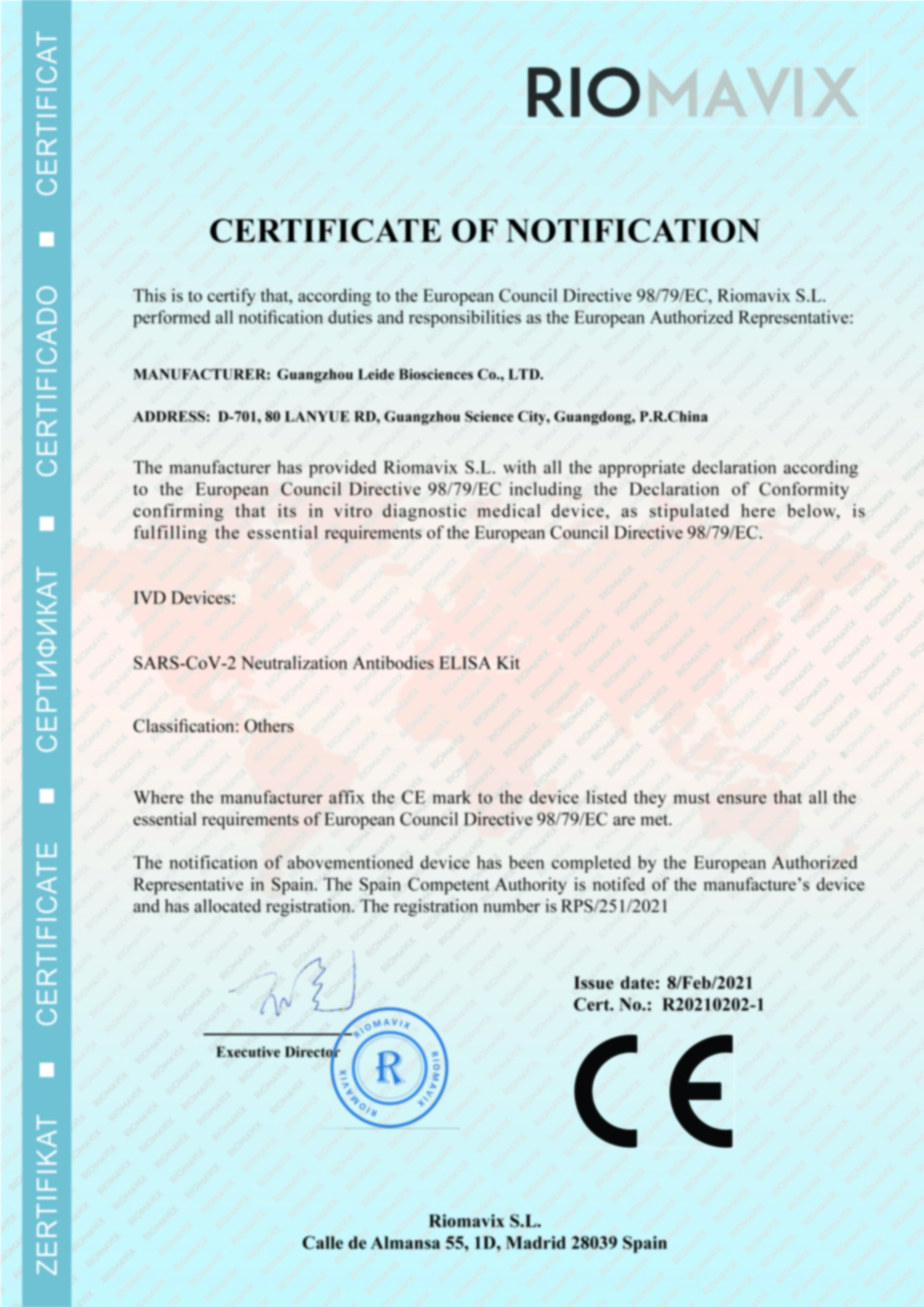 近日,由廣州市雷德生物科技有限公司(簡稱“雷德倍爾”)自主研發(fā)的新型冠狀病毒(2019-nCov)特異性細胞免疫反應(yīng)檢測試劑盒以及新型冠狀病毒(2019-nCov)中和抗體檢測試劑盒(ELISA),于2021年2月8日獲得CE認證。