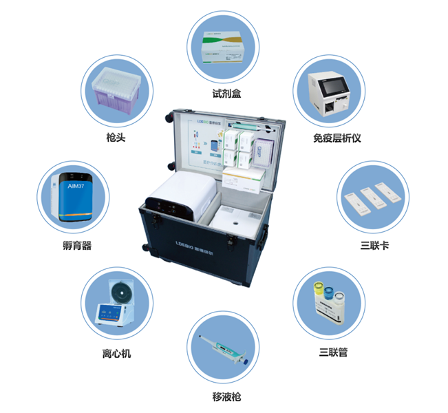 雷德倍爾可移動結核檢測系統mIGRA??,外觀為一個小小的移動箱,內里乾坤豐富,內含孵育器、熒光免疫分析儀、移液器、離心機、γ 干擾素(IFN-γ)檢測試劑盒、細胞刺激試劑盒等結核感染檢測所需的所有設備物料,具備可移動、高性能、易操作等特點,即拎即走,即到即測,特別適合基層和偏遠海島村民檢測。