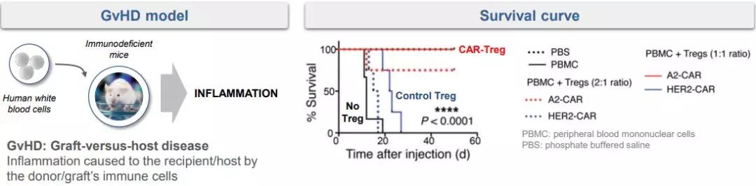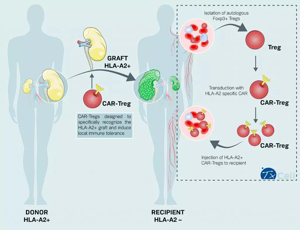 HLA-A2 CAR-Treg是TxCell公司的CAR Treg明星候選產品,它基于CD4+ FoxP3 + Treg的一個子集,靶向移植中常見的錯配抗原HLA A2,正在開發用于預防器官移植后的慢性排斥反應。目前,HLA-A2 CAR Treg已經在臨床前GvHD模型中顯示出了強有效性,相關臨床試驗正在準備階段。