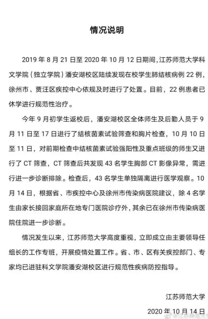 2019年8月21日至2020年10月12日期間,江蘇師大潘安湖校區(qū)陸續(xù)發(fā)現(xiàn)在校學(xué)生肺結(jié)核病例22例,患者均已休學(xué)并進(jìn)行持續(xù)至少半年的規(guī)范抗結(jié)核治療。經(jīng)重點(diǎn)篩查,另發(fā)現(xiàn)43名學(xué)生胸部CT影像異常,需進(jìn)一步排查。
