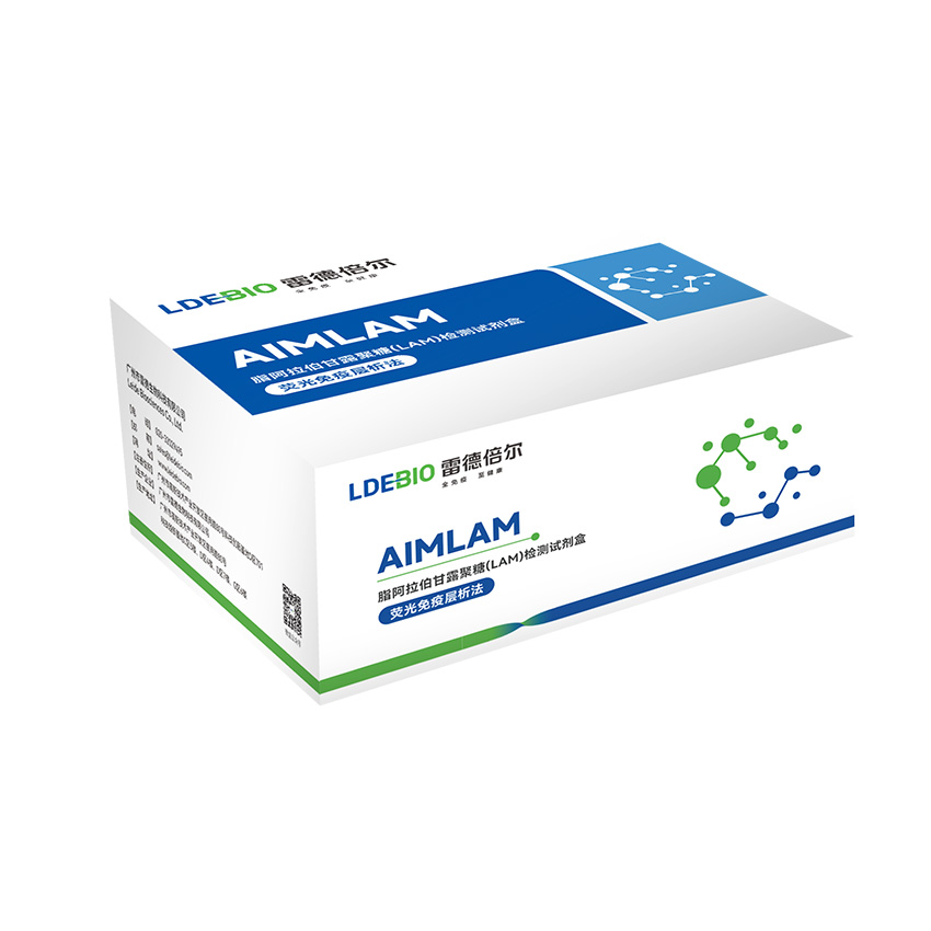 本產品檢測采用雙抗體夾心法原理。將待測樣本滴加至測試卡的加樣孔中,樣本中的待測物與熒光墊上的熒光標記抗體結合形成反應復合物。在層析作用下,反應復合物沿著硝酸纖維素膜向前移動,被硝酸纖維素膜檢測線上包被抗體所捕獲。樣本中的LAM越多,檢測線上積聚的復合物越多,熒光抗體的信號強度反映了被捕獲的LAM數量。通過熒光免疫分析儀可檢測出樣本中LAM的濃度。